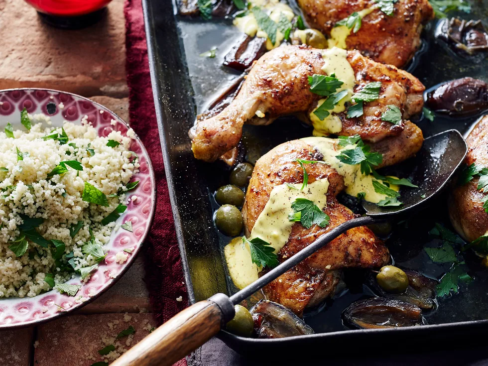 3.Put the chicken pieces into a deep baking dish that is large enough to hold them in one layer. Rub the oil mixture over the chicken. Pour the stock into the base of the dish and add the dates and olives. Bake in the oven for 1 hour or until the chicken is cooked through.