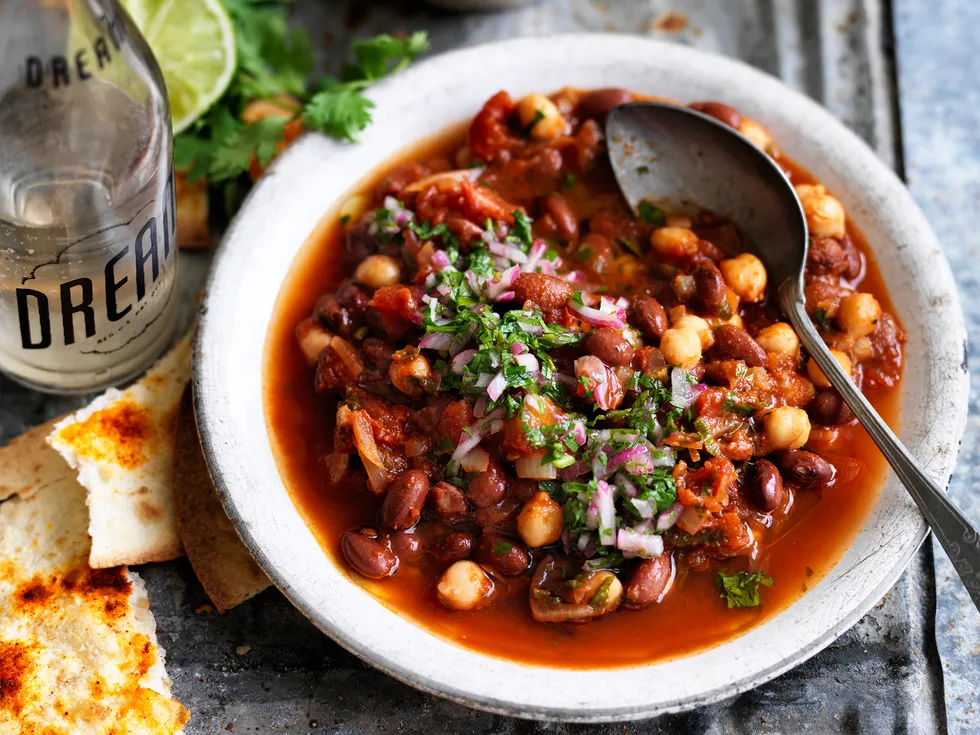 5.Add beans, chickpeas, chipotle mixture, tomatoes and the water; bring to the boil. Reduce heat; cook, for 15 minutes or until sauce thickens.