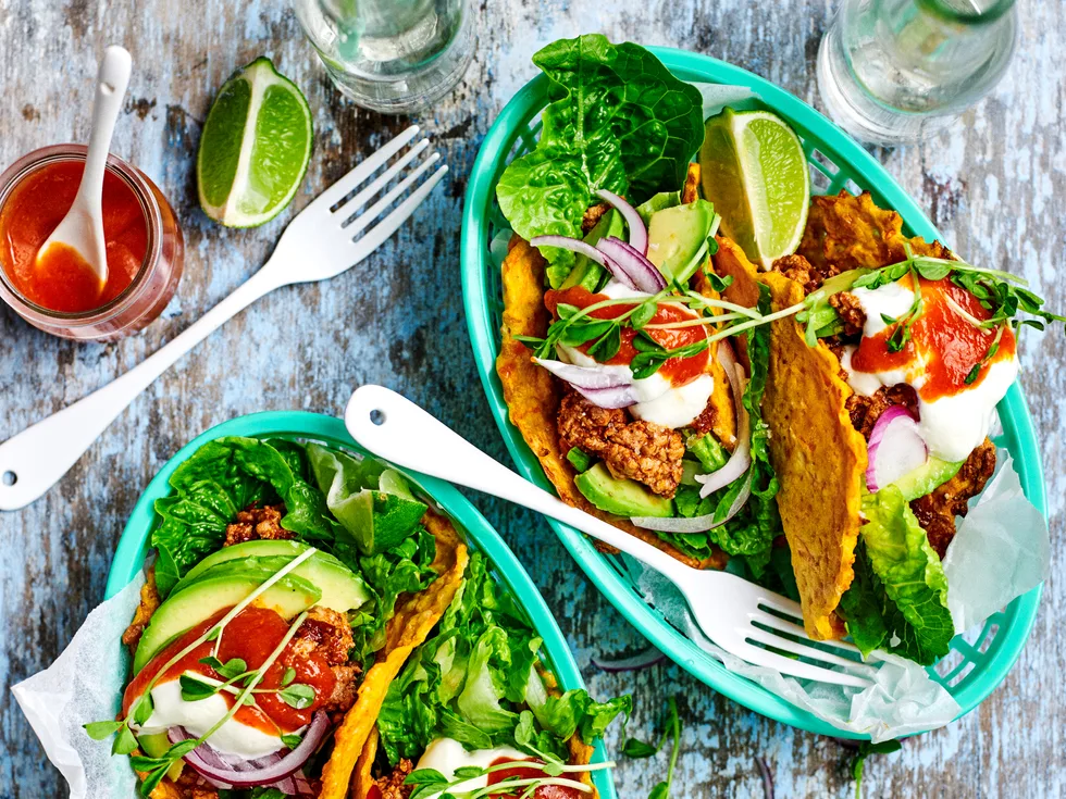 4.Swirl extra adobo sauce, if using, through yoghurt. Divide lettuce, mince mixture, avocado, combined lime juice and onion, yoghurt mixture and pea shoots evenly among carrot taco shells. Serve with lime wedges, extra lettuce leaves and chilli sauce.