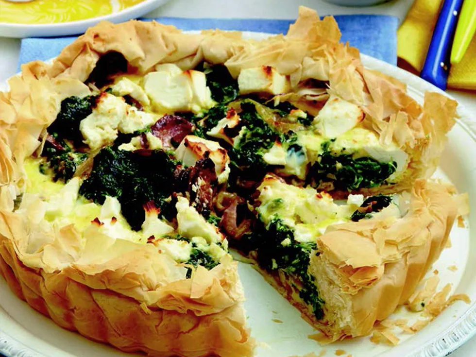 4.Whisk eggs and cream in a jug. Spoon chorizo mixture over base of pastry shell. Squeeze excess liquid from spinach; scatter over chorizo. Top with fetta. Pour over the cream mixture. Scrunch the pastry overhang to partially cover filling, leaving a hole at centre. Bake for 35 minutes or until just firm. Serve with salad.