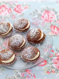 6.To serve, slice each cake almost in half and fill it with a spoonful of the whipped cream. Give each cake a generous dust of the icing sugar.
