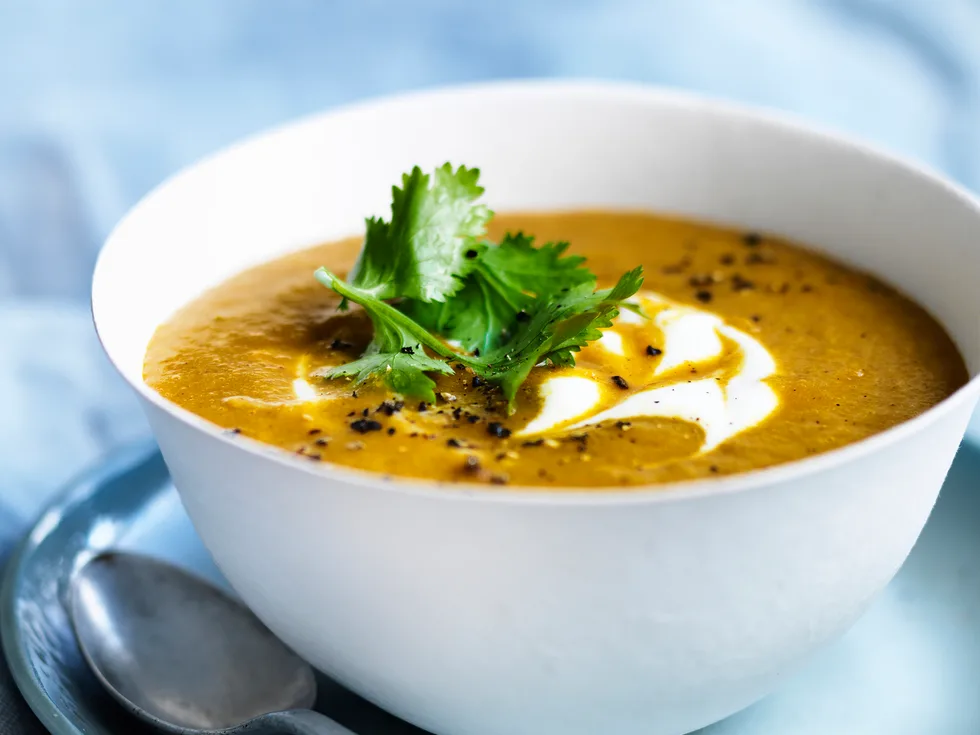 5.Blend or process soup until smooth. Serve topped with remaining coriander leaves; accompany with yoghurt and pappadums.
