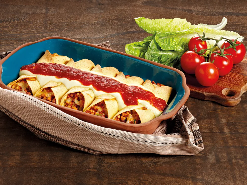 3.Place 2 large spoons of mince mixture into centre of each Tortilla, top with a sprinkle of cheese and fold over to create a tube. Place folded side up in a lightly greased oven proof dish. Repeat with remaining filling, cheese and tortillas. Top with sour cream & drizzle reserved Enchilada Sauce over. Bake for 15-20 minutes until golden and bubbling. Enjoy with a fresh side salad.