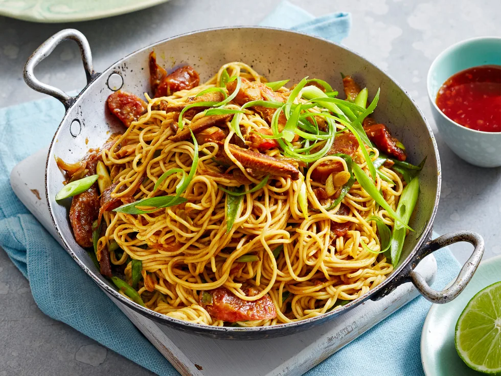 Toss sweet chilli sauce and sesame oil through drained noodles. Top with extra shredded spring onion and accompany with lime.