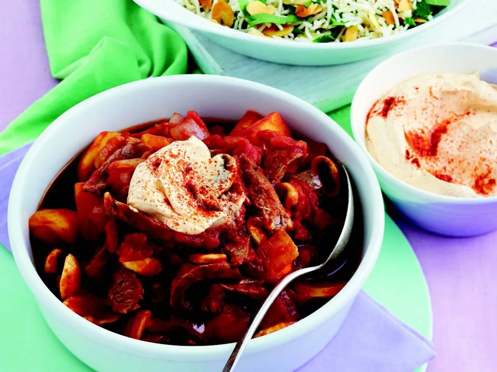 5.Combine the rice, parsley and almonds in a bowl. Whisk sour cream and extra paprika in a bowl. Serve goulash with rice and paprika cream.