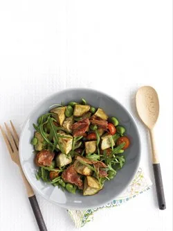 4.To prepare the dressing, combine all the ingredients. Place the rocket, kumara, broad beans, halved cherry tomatoes and prosciutto in a salad bowl. Add the dressing and toss gently.