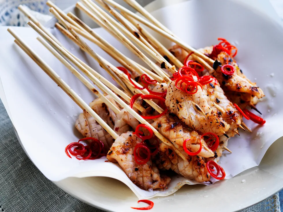 4.Place skewers on a large platter; sprinkle over chilli, accompany with lemon wedges.