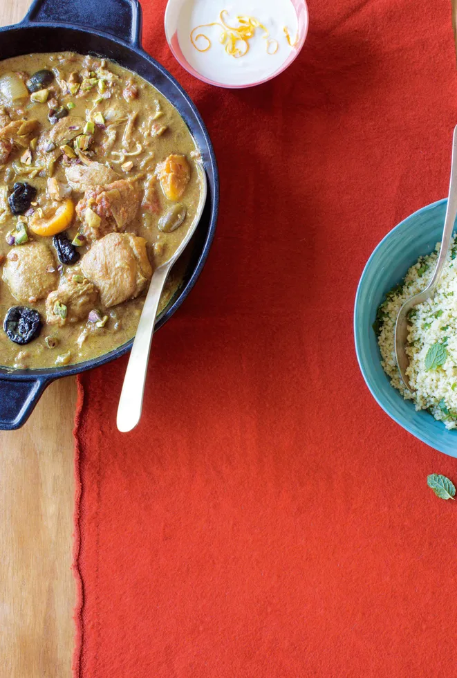 3.Add 2 tablespoons of olive oil to the pan along with onions. Cook over a medium heat, stirring, for 5 minutes. Add garlic and ginger, cooking for 2 minutes. Add dry spices and chilli, cooking for 1 minute. Add stock, tomatoes, yoghurt, dried fruit, olives and lemon zest. Stir and pour over the chicken. Cover and bake for 1½ hours. Stir and season with salt.
