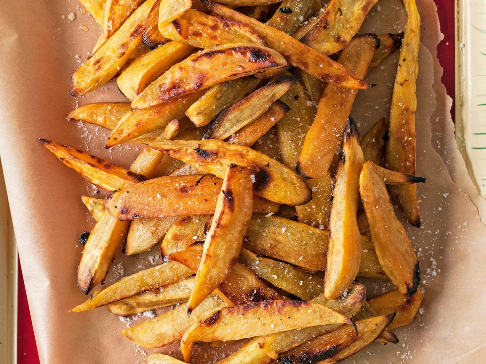 Bake in the oven for about 25 minutes, turning once with tongs, or until golden. Sprinkle with sea salt and serve hot.