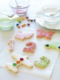 7.To make the icing, beat the egg whites until they are becoming frothy. Add the icing sugar, half a cup at a time, mixing until it becomes glossy and is a spreadable consistency. Divide the icing into 2-3 small bowls and add a drop or two of food colouring to each. Ice the biscuits and decorate them with sprinkles and lollies such as Smarties.