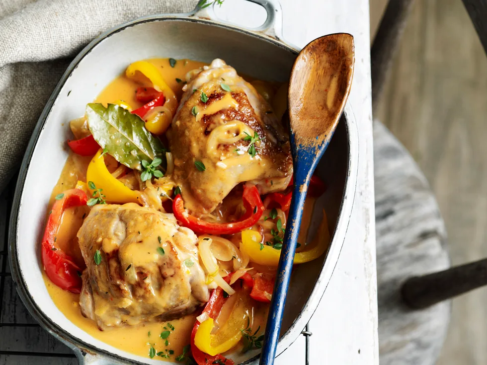 2.Heat remaining oil in cooker; cook onion, garlic and capsicums, stirring, until onion softens. Add paste; cook, stirring, 1 minute. Return chicken to cooker with wine, stock, bay leaves and thyme sprigs; secure lid. Bring cooker to high pressure. Reduce heat to stabilise pressure; cook 15 minutes.
