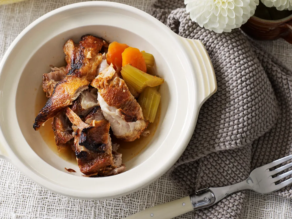 4.Put vegetables in a saucepan with 1½ Tbsp oil, cover with a lid and cook gently for 15 minutes until wilted; don’t brown. Use a scraper to transfer to the bowl of a slow cooker. Pour in cider. Transfer pork to slow cooker browned side facing up. Spread remaining spice mixture over the top of the meat. Cover with a lid and cook for 4 hours until so tender the meat is falling off the bone.
