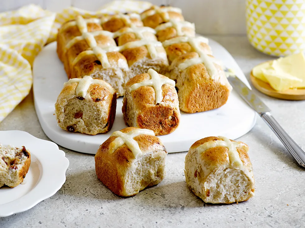 5.For the crosses, combine flour and sugar; gradually blend in enough water to form a smooth, firm paste. Using a piping bag with a small, plain nozzle, pipe crosses onto buns. Bake buns for 20 minutes; turn onto a wire rack.