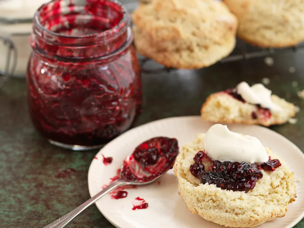 I know it’s not the old-fashioned way of making jam, but it is fool proof and sometimes you just need to know it’s going to work and set perfectly. You can use either fresh berries (blackberries, raspberries, strawberries and blueberries) but also thawed frozen berries. I used half and half. The little knob of butter adds a silky texture. These scones are fun to make and a perfect match with whipped cream and a dollop of deliciously fruity jam. Makes 4 jars of jam Makes 8-10 scones