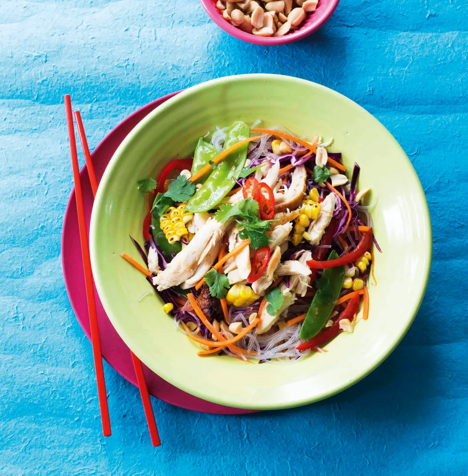 4.Place noodles on a large platter or in bowls, then top with the dressed salad, chopped fresh herbs, roasted peanuts and some chopped fresh chilli, if you like.