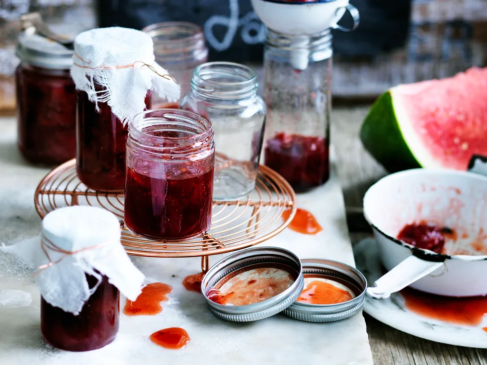 Try this with scones, as a sponge filling, or stirred though ice-cream. Jam-setting sugar is a special blend of sugar containing naturally occurring pectin and citric acid. It is used with fruit that is naturally low in pectin, such as berries. Jam sugar can be found in supermarkets and delis. You need approximately a 600g piece of watermelon to start with. Save the rind to make watermelon rind pickles.
