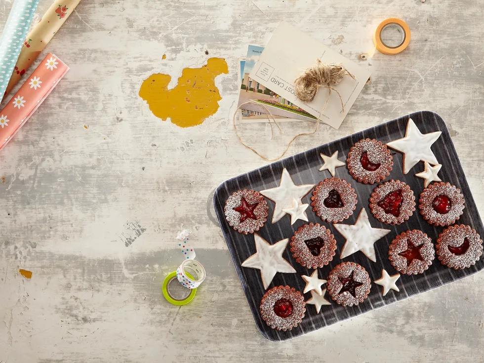 5.Cut out carefully into large or small stars (dip the cutters in water to prevent them sticking) and then transfer to the baking sheets using a spatula. Press the scraps together, re-roll and cut more stars.